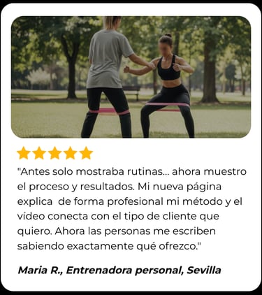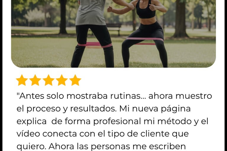 "Antes solo mostraba rutinas… ahora muestro el proceso y resultados. Mi nueva página explica de forma profesional mi método y el vídeo conecta con el tipo de cliente que quiero. Ahora las personas me escriben sabiendo exactamente qué ofrezco."