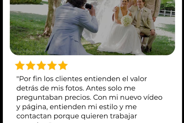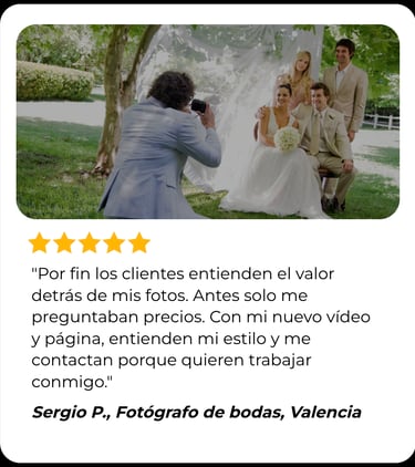 "Por fin los clientes entienden el valor detrás de mis fotos. Antes solo me preguntaban precios. Con mi nuevo vídeo y página, entienden mi estilo y me contactan porque quieren trabajar conmigo."