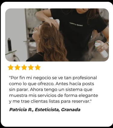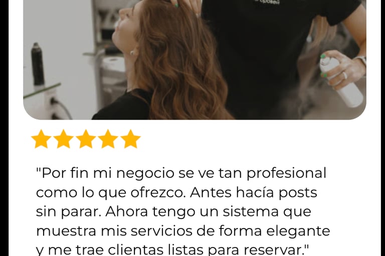 "Por fin mi negocio se ve tan profesional como lo que ofrezco. Antes hacía posts sin parar. Ahora tengo un sistema que muestra mis servicios de forma elegante y me trae clientas listas para reservar."