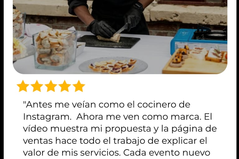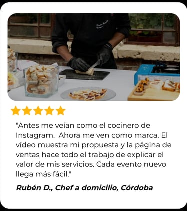 "Antes me veían como el cocinero de Instagram. Ahora me ven como marca. El vídeo muestra mi propuesta y la página de ventas hace todo el trabajo de explicar el valor de mis servicios. Cada evento nuevo llega más fácil."
